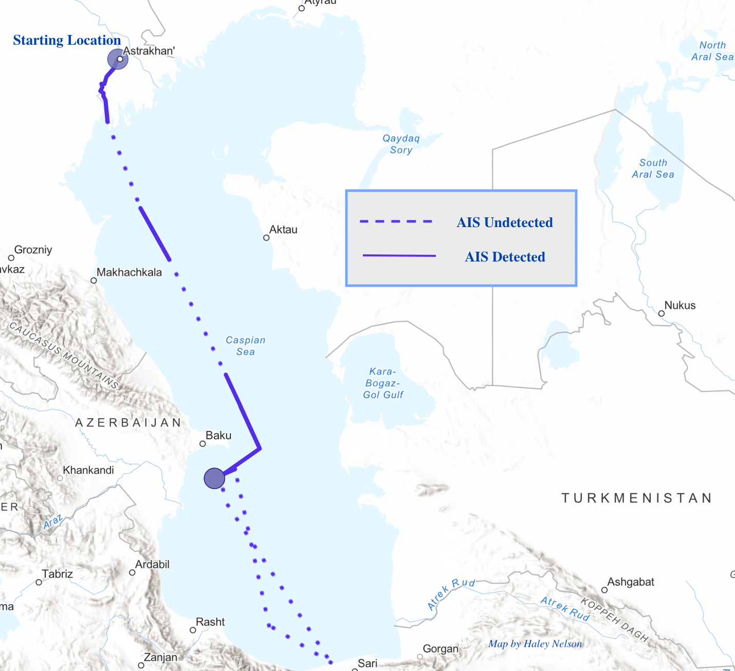 إحدى هذه السفن تحمل اسم “لاوجا” (Lauga)، ورقم المنظمة البحرية الدولية الخاص بها هو #911060. وبين 18 يوليو و15 أغسطس 2023، تم تتبع هذه السفينة عبر موقع (Fleetmon) وهي تتحرك من ميناء أستراخان الروسي شمال القزوين، ثم تتوقف خارج حدود بحر القزوين التابعة لإيران مباشرة. ويُقدر أن السفينة أوقفت نظام (AIS) الخاص بها لتسليم شحنات إلى إيران، ثم عادت إلى موقعها السابق داخل الحدود البحرية لأذربيجان.